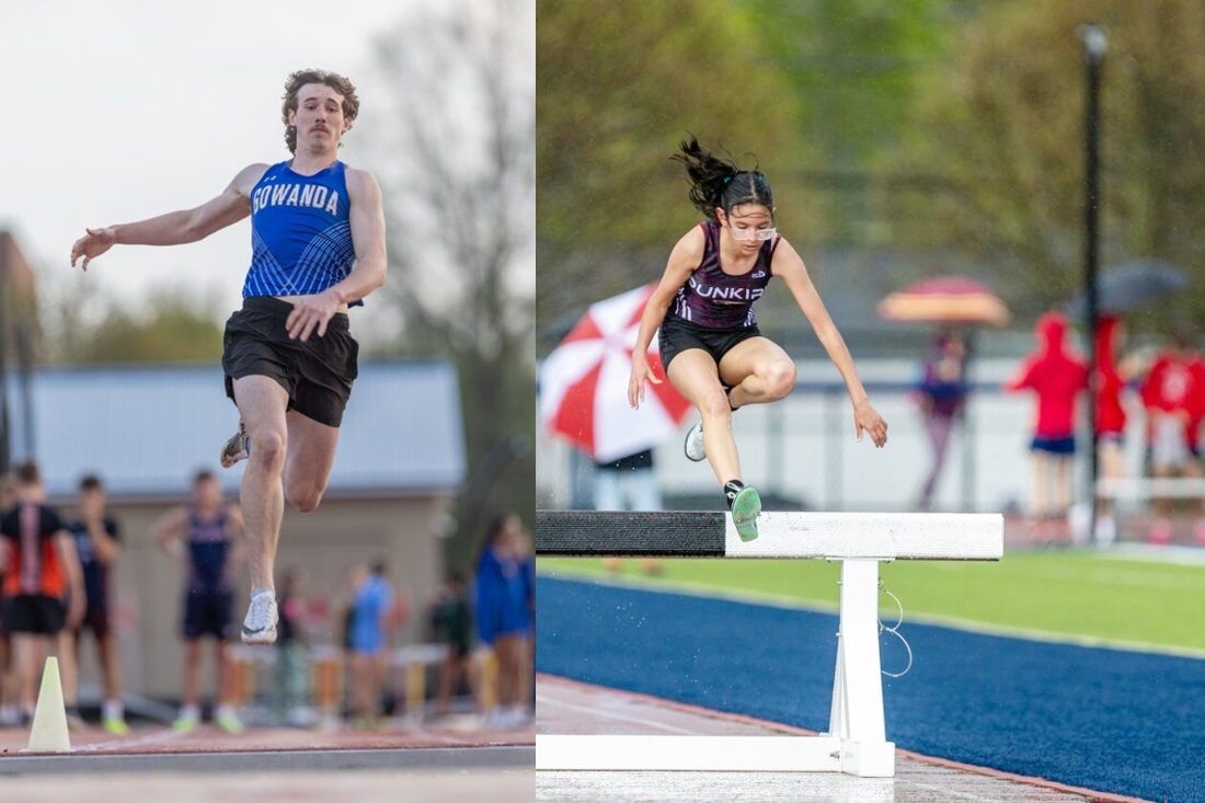 OBSERVER Photos by Tim Frank Above left, Gowanda's Maddox Hudson competes in the long jump. Above right, Dunkirk's Hanan Mohamad Narvaez clears a barrier on her way to a second-place finish in the 2,000-meter steeplechase at the Golden Falcon Track & Field Invitational on Friday night at Bill Race Field in Falconer.