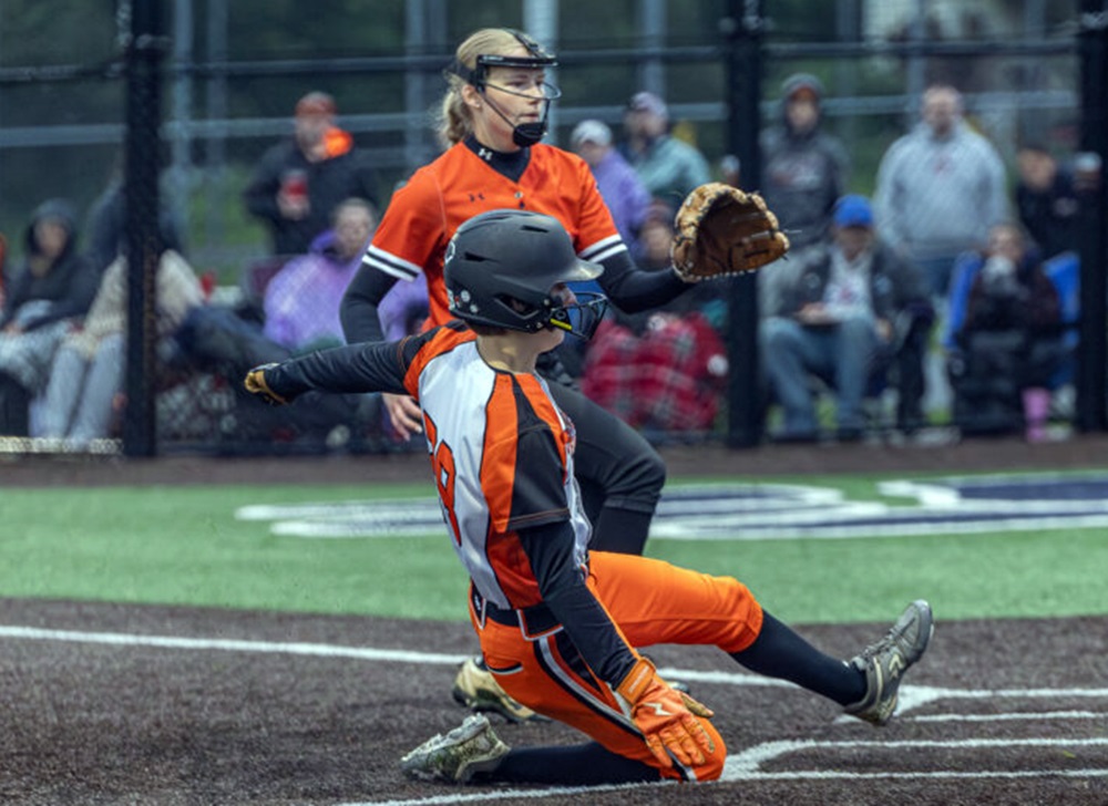 OBSERVER Photo by Sideline Images of WNY Randolph's Aryana Sears slides safely into home before Westfield's Sydney Hotchkiss receives a throw during Thursday's Section VI Class C quarterfinal in Gowanda.