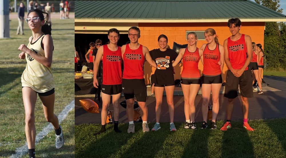 Above left, Hanan Mohamad Narvaez runs for the Black Knights in cross country action at the Martin Road Athletic Complex on Tuesday. OBSERVER Photo by Scott Kindberg Above, right, Fredonia honored its cross country seniors on Tuesday evening. Pictured, from left, are: Griffin Paternosh, Cole Tenamore, Liz Proper, Brooke Luce, Allie Hellwig and Nathan Keefe. Absent is Jimmy Fagan. Submitted Photo