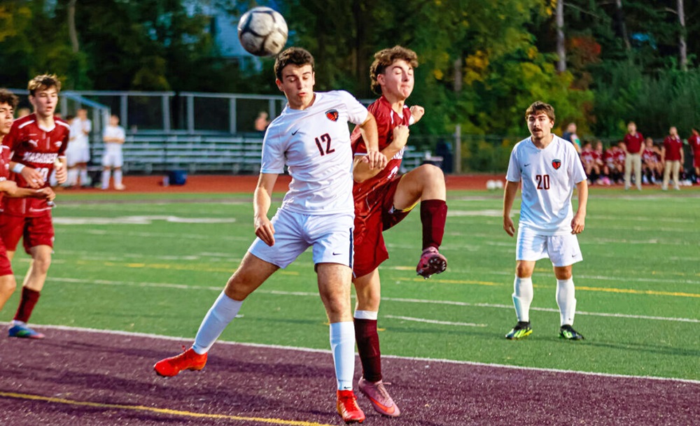 OBSERVER Photo by Ashleigh Brown Fredonia's Brennan Cave (12) and Dunkirk's Alex Biscaro battle for a header.